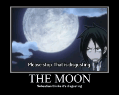 | 1: Please stop. That is disgusting. THE MOON Sebastian thinks its disgusting. 2: STALKERS They follow you everywhere. 3: BUTLER ATTACK #1 Deadly plate throw. 4: BUTLER ATTACK #2 Flying Butler knife-weilding technique. 5: GRELL He is flameing. (Literally.) 6: Nothing. Probably a cat. PROBABLY A CAT Yeah, a cat that can knock over a 100 pound tree. -__- Really Claude? 7: YOUR SHENANIGANS Ciel has had quite enough of them. |